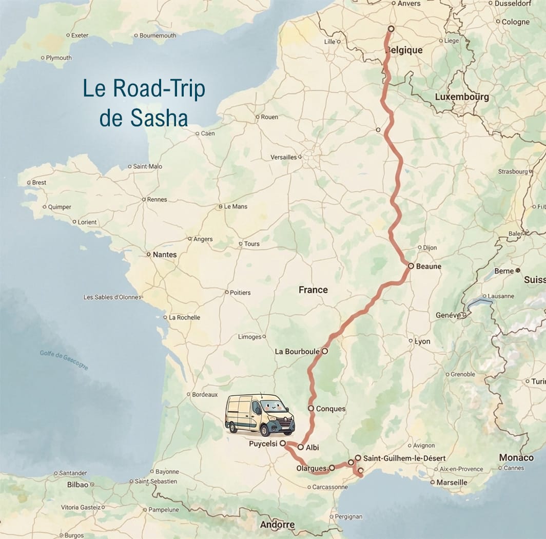Au fil des kilomètres, le voyage devient une suite de rencontres, de haltes, de forêts traversées à pas lents. Le Tarn s’impose alors comme une évidence. Ses reliefs doux, ses villages perchés, ses routes sinueuses offrent à Sasha un sentiment d’ancrage inattendu.