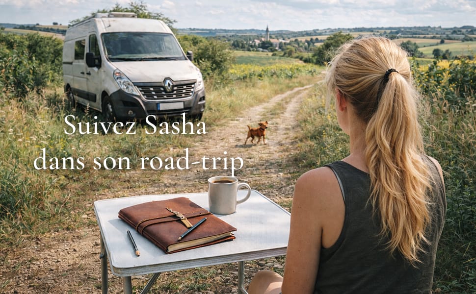 Sasha part avec peu de choses : un fourgon aménagé, un carnet de croquis, Léo, un petit chien abandonné, et ce besoin profond de découverte. Elle cherche des paysages, du silence, des chemins secondaires. Elle veut se perdre un peu, pour mieux se retrouver.